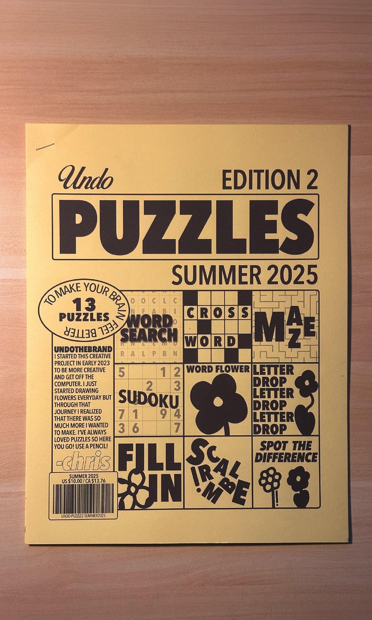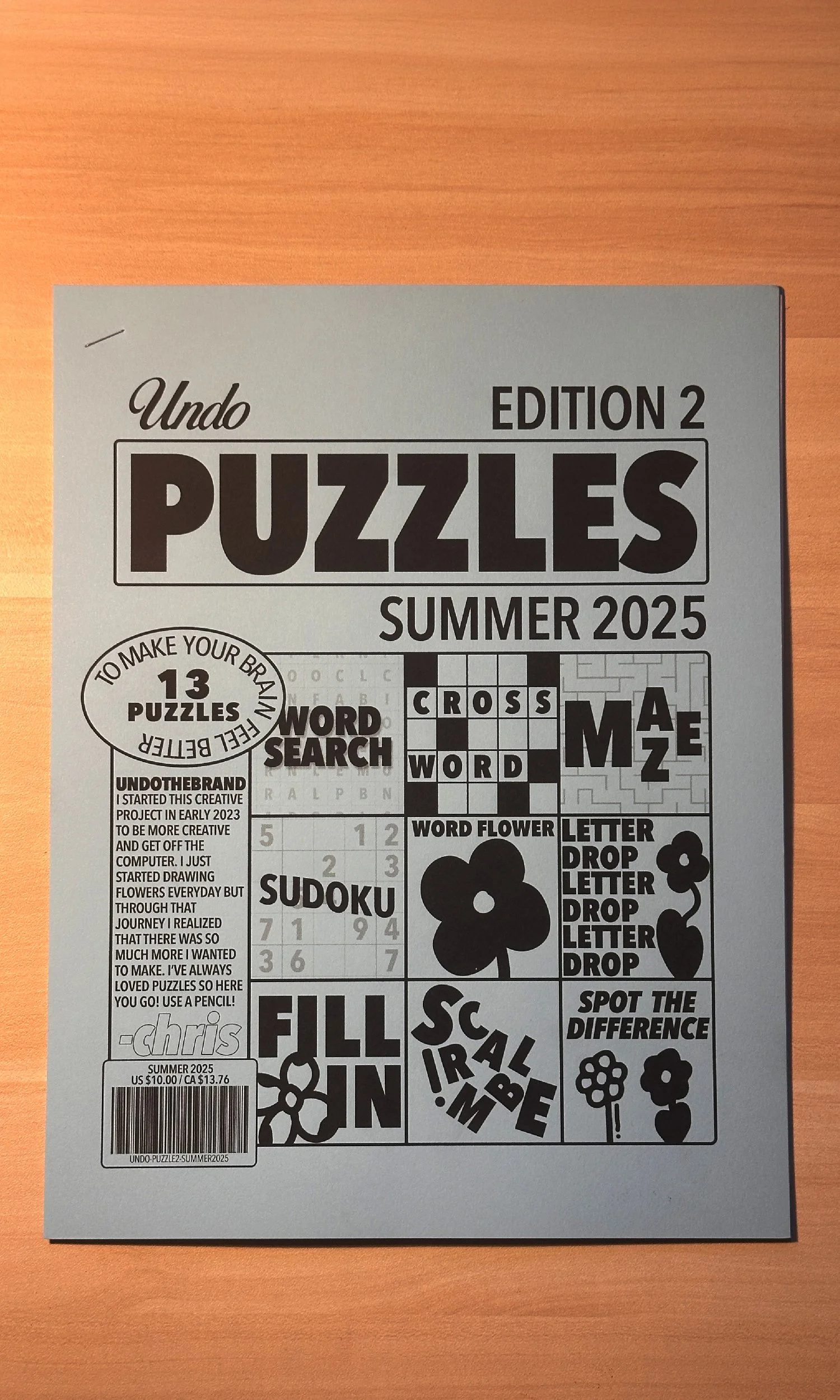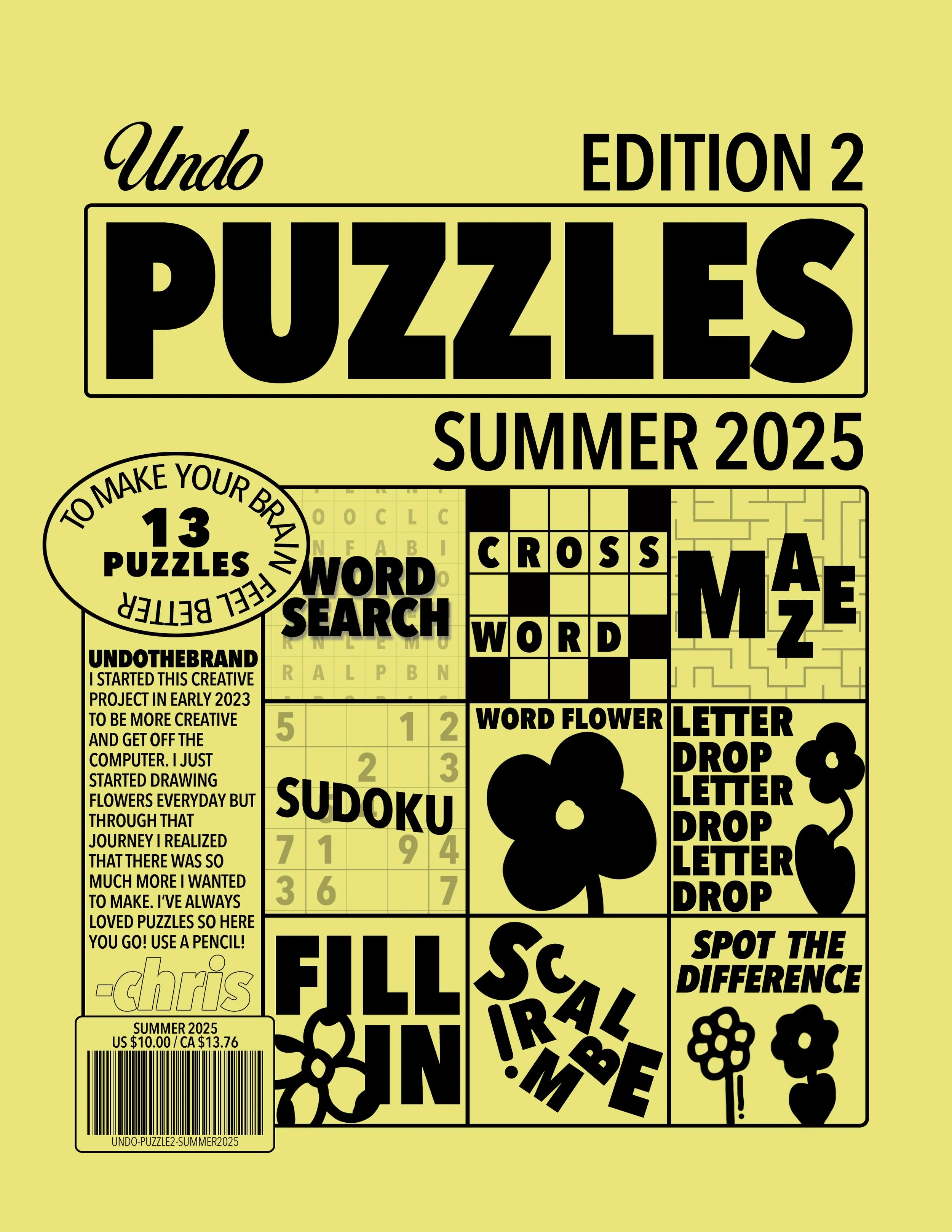 Try to solve this! The new UNDO Puzzle Book features 13 brand-new puzzles for you to enjoy. I hand-designed every puzzle from the ground up, and my original artwork is scattered throughout the book. Puzzles include word searches (easy and hard), crossword, sudoku, spot the difference, letter drop, maze, word flower, fill-in, and scramble. The difficulty ranges from easy to medium.